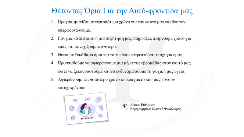 Η πίεση της καθημερινότητας και των υποχρεώσεων, οδηγεί σε υπερφόρτωση του εαυτού μας και επιδείνωση της ψυχικής μας υγείας. Έτσι, αφού πολλές φορές, δεν μπορούμε να ελέγξουμε το εξωτερικό περιβάλλον και τους εξωτερικούς παράγοντες που μας επηρεάζουν, χρειάζεται να θέσουμε όρια για να διασφαλίσουμε την ψυχική μας υγεία. Φροντίστε τον εαυτό σας λοιπόν, θέτοντας όρια χωρίς να νιώθετε ενοχές!